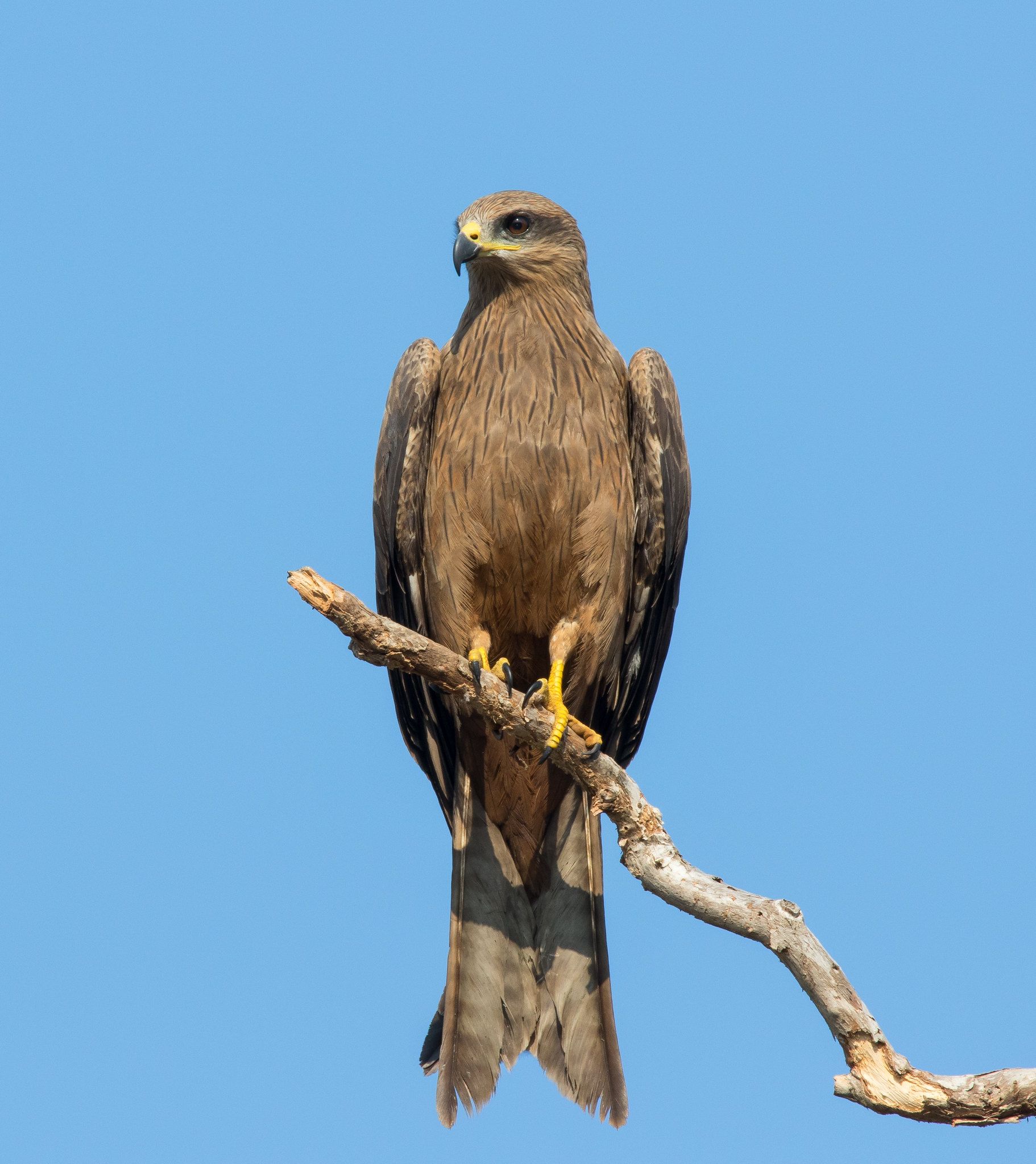 Dark brown, medium-size hawk with noticeable forked tail while in flight. Often found in flocks of 100s to 1000s, principally a scavenger and will take advantage of human activity by hunting near tips, campgrounds, firefronts etc.