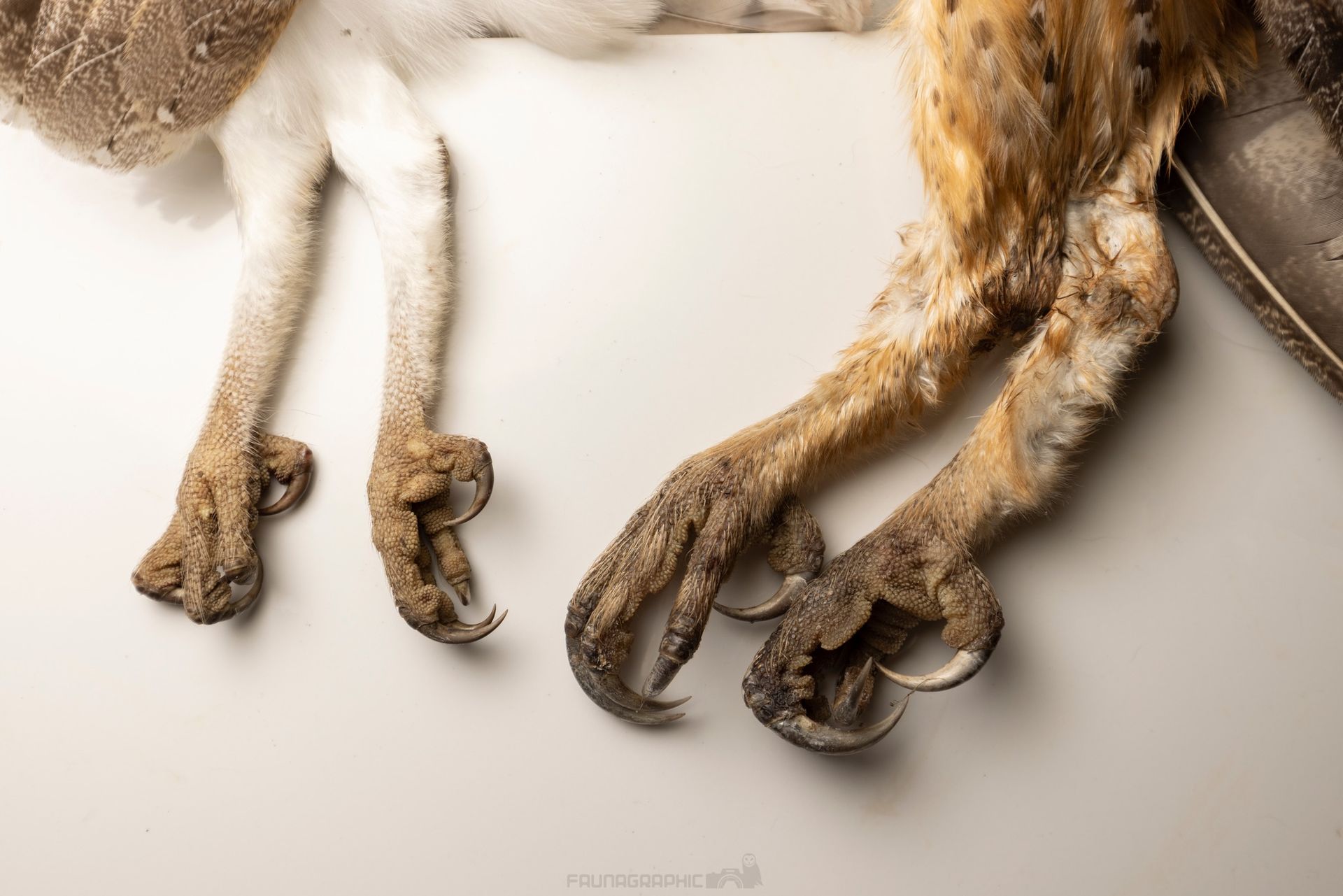 The legs of an Eastern Barn Owl are dainty and not fully feathered. Their feet are much smaller overall whereas with Australian Masked Owl the legs are more powerfully built and fully feathered to the feet. Their feet are much larger along with the talons.
