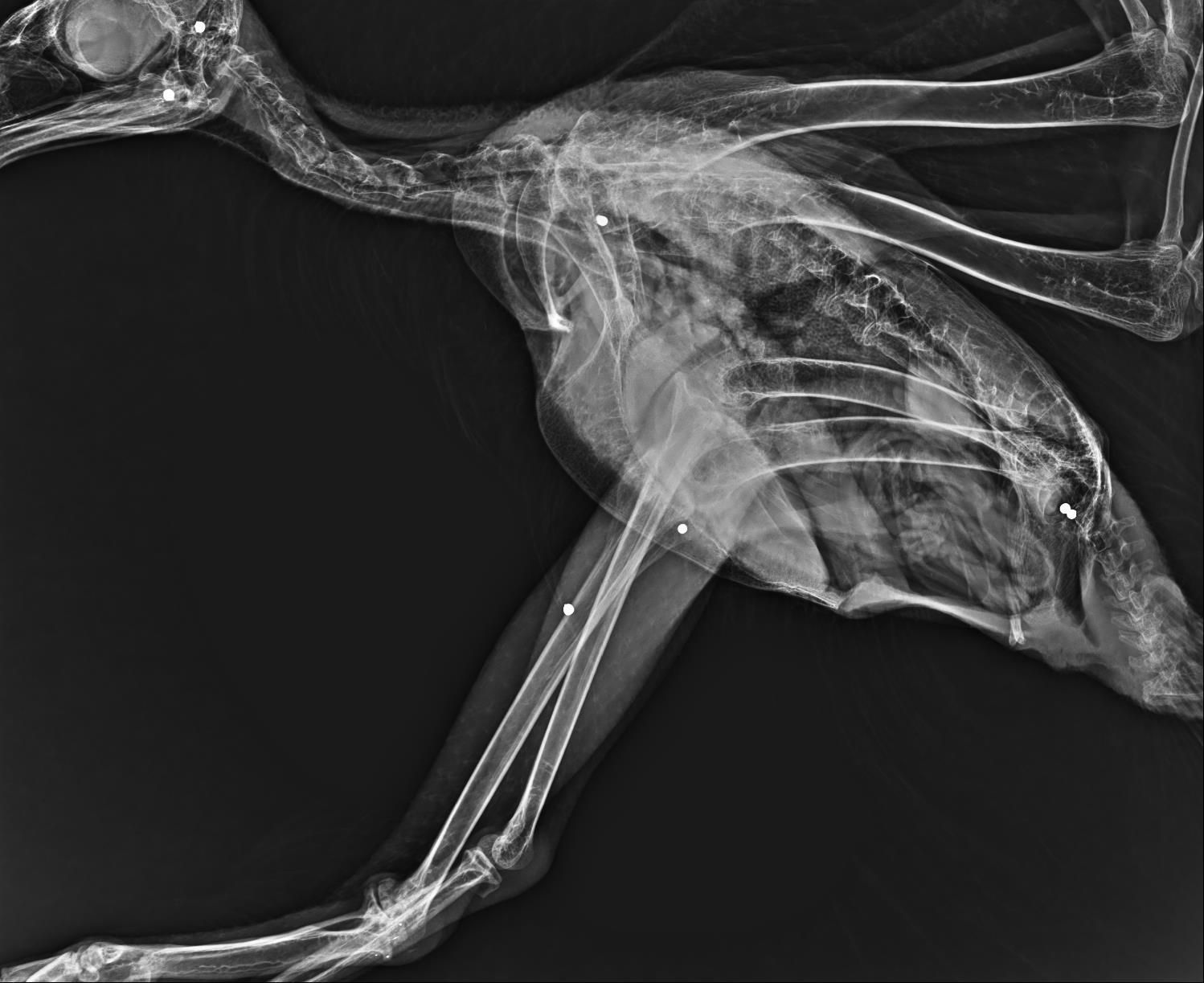This Wedge-tailed eagle was also shot with an air rifle or pellet gun, over and over again. The radiographs below show the numerous pellets in the head and the body. Thankfully none of the shotgun pellets had entered her digestive tract, which meant lead toxicosis was not an issue. after recovering from her injuries, she was release into the Peter Spitzer free flight aviary at HGRC to begin pre release fitness activity.