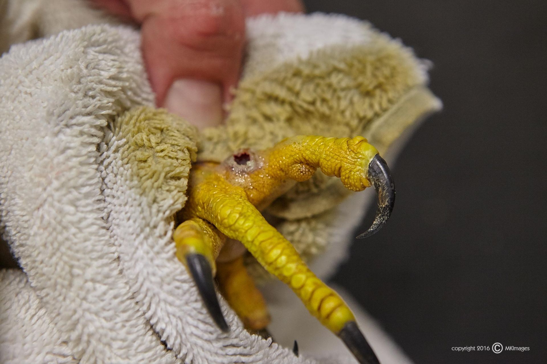 The bird had multiple impact wounds and numerous pieces of glass lodged in her body, particularly the feet. After successful treatment and rehabilitation she underwent pre-release fitness and was then released back where she was found, flying straight to a local dam, much to the horror of the ducks!